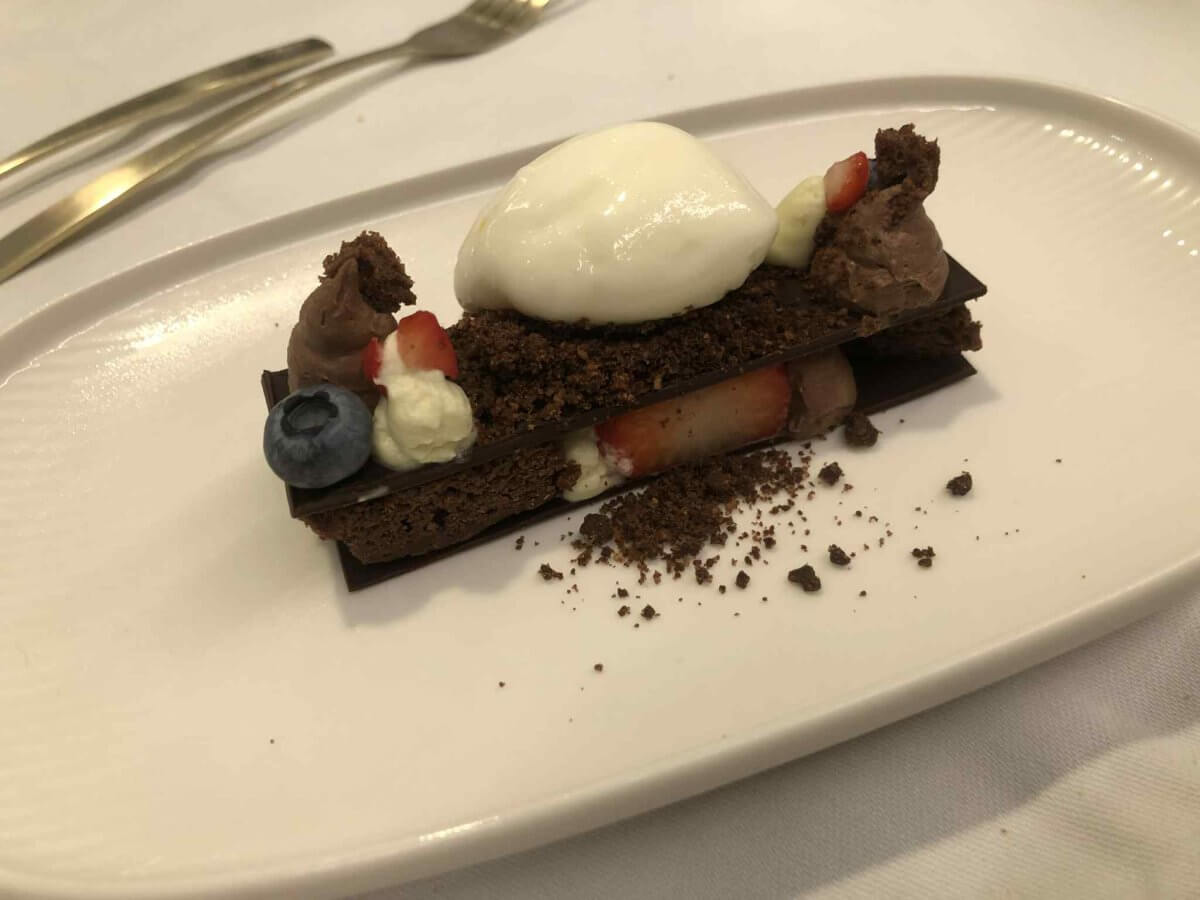Auch bei den Hauptgerichten beweist die Küche ihr Können. Das Hirschragout mit Spinat-Gnocchi und Karfiolcreme überzeugt ebenso wie der gebratene Stör mit Berglinsen. Ein Veilchensorbet beziehungsweise „Schokolade“ mit Erdbeeren lassen den Abend verführerisch-süß ausklingen.